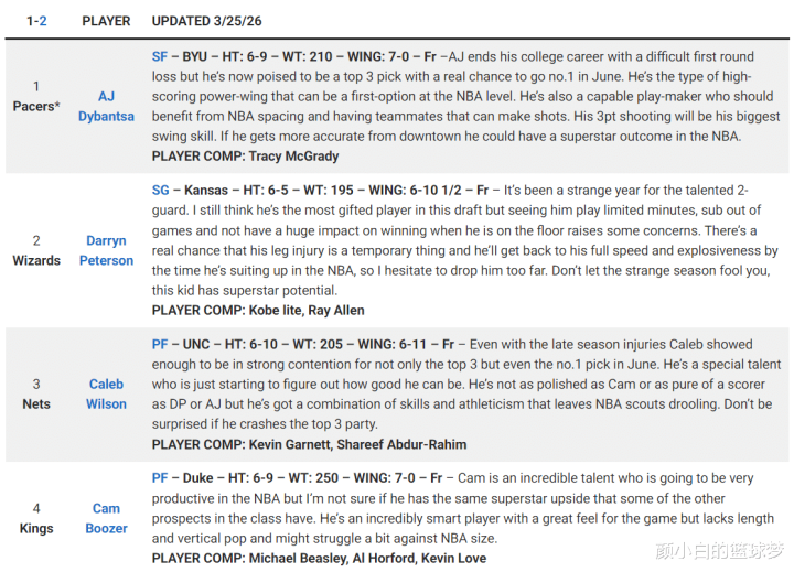 而在DX的预测上,布泽尔的预测顺位是第四,最终是由国王选中他。状元的人选都是杨百翰大学的迪班萨,看起来四号位的布泽尔被看衰前景。