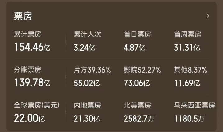 在中国内地之外,《哪吒2》的表现也很不错,北美票房近2600万美元,马来西亚票房超1100万美元,中国香港票房也有750多万美元。