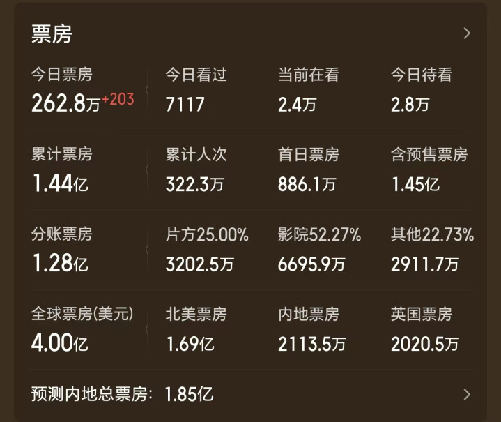 在中国国产电影影史当中,也就只有去年的《哪吒2》,真正登顶了全球年度票房冠军。